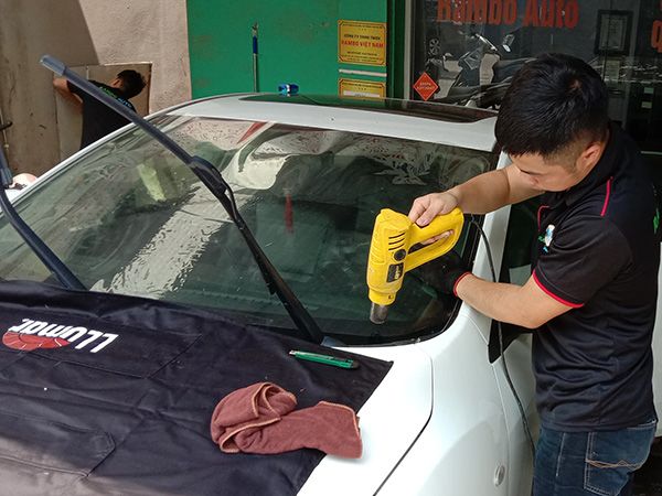 Bước 5: Sấy phim cách nhiệt. Kính xe ô tô không phẳng mà thường có độ cong lớn, nhất là kính lái và kính hậu. Do đó để lớp phim ôm theo độ cong mặt kính cần dùng máy sấy phim cách nhiệt để sấy nóng làm phim co, cong và ôm theo mặt kính.